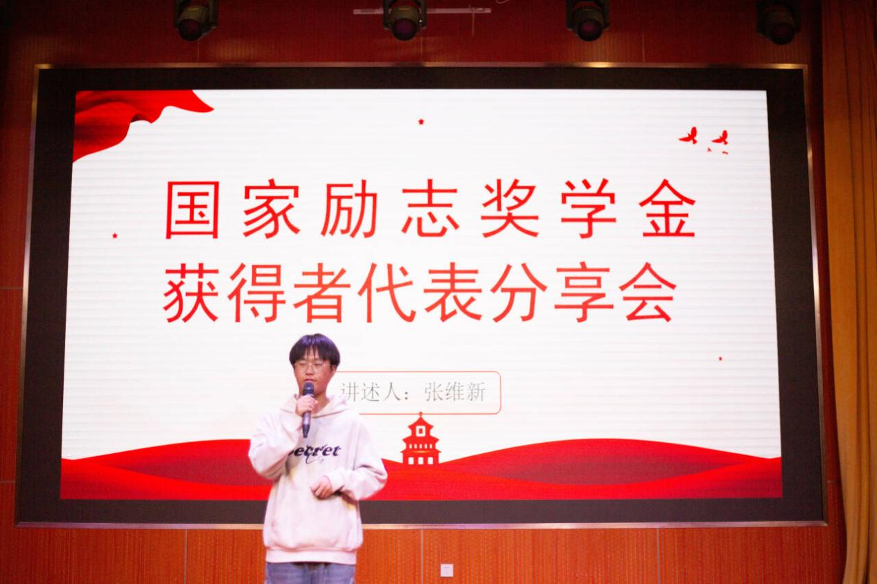 分享会上,国家励志奖学金获得者代表张维新以“新的环境,新的挑战,新的开始”开篇,强调“机会不光留给有准备的人,更留给勇敢解决问题、敢于克服困难的人”,鼓励同学们在大学新征程中主动出击、直面挑战。随后,以“小米舆论事件”为例,生动阐释信息爆炸时代,学子须具备理性判断、追本溯源的思维能力,这既是专业学习的底层逻辑,也是个人成长的核心素养。