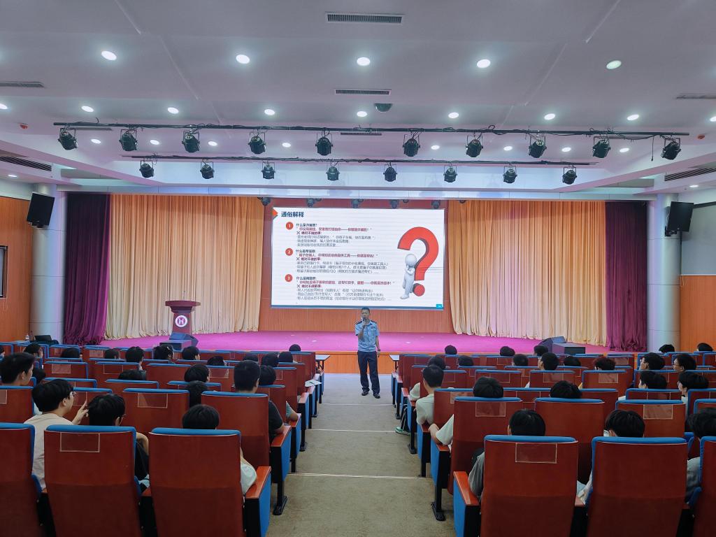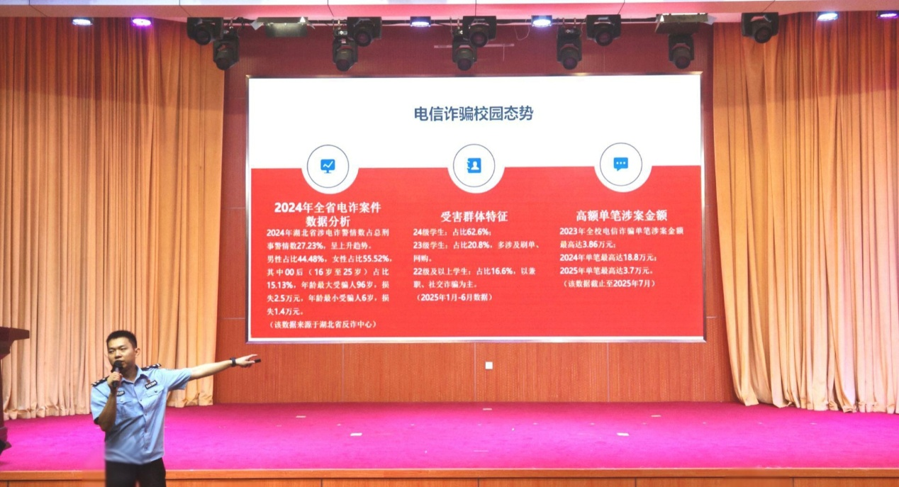 随后,朱晟杰警官结合了2024年湖北全省电信诈骗案件数据分析、受害群体特征和高额单笔涉案金额等方面详细分析电信诈骗的校园态势,提醒同学们牢记“四不”原则:不轻信陌生来电、不泄露短信验证码、不点击可疑链接、不向所谓“安全账户”转账。此外,他还重点指导同学们若不慎遭遇电信诈骗后的正确应对方式,包括如何及时留存证据、快速报警求助,最大程度降低财产损失。